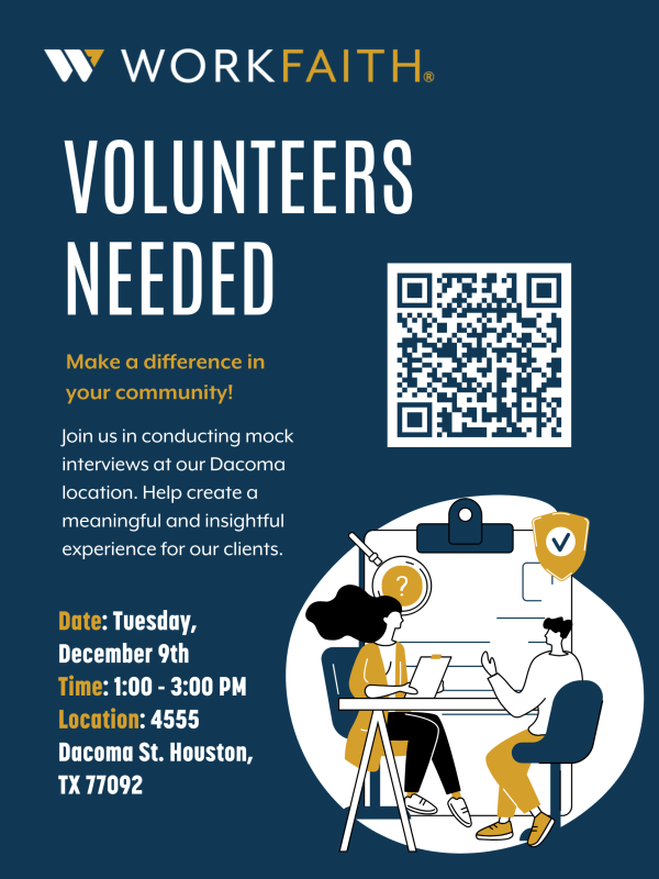 Come join us at 4555 Dacoma St., Suite 200, Houston, TX 77092 to conduct mock interviews and impact someones life today!